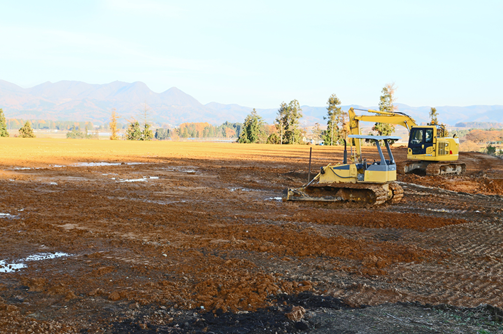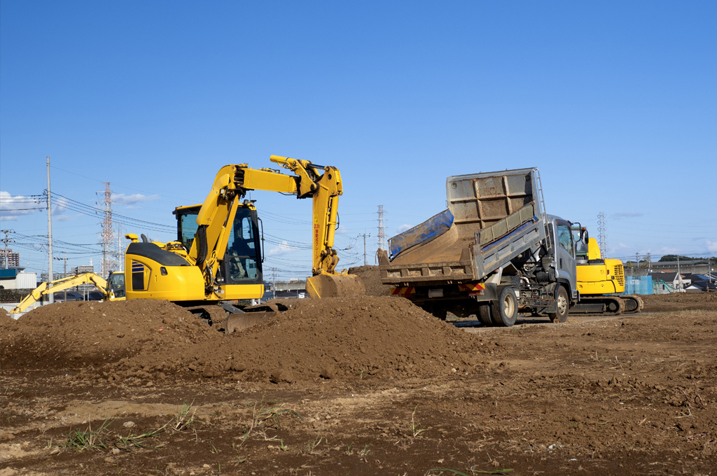 バックホウやブルドーザーなど各種重機を使用し、造成・整地工事を行っています。土地の形状や用途に合わせた施工計画により、効率的かつスムーズな造成工事を実現。造成から整地、残土処理まで一貫対応が可能です。